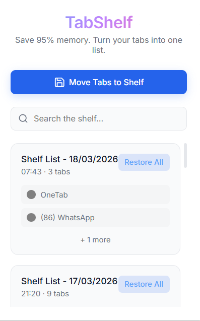 TabShelf sweeps your open tabs into a highly-compressed, searchable list instantly. Memory is released immediately, but your context is perfectly preserved and date-stamped for easy retrieval whenever needed.